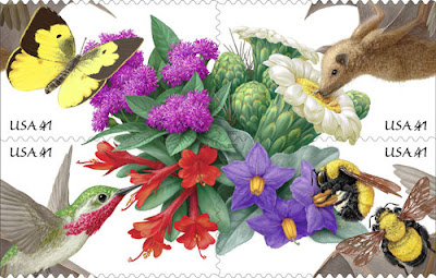The United States Post Office honored Pollinators with a beautiful series of stamps that show four different important pollinators. The wind and man were not included here, mind you.